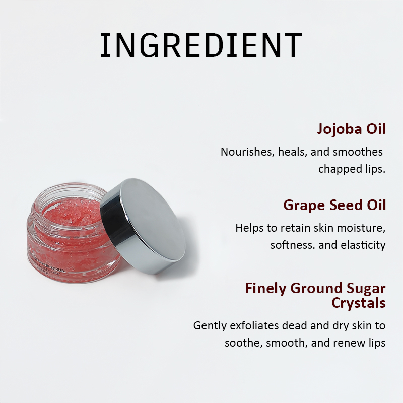 Ingredientes principais: Açúcar, Cranberry, Óleo de Jojoba, Óleo de Coco, Cera de Abelha, Vitamina E, Extrato de Prunus davidiana, Extrato de Portulaca Grandiflora, Extrato de Flor de Lonicera Japonica, Cranberry, Extrato de Taraxacum mongolicum, Hialuronato de Sódio, 1,2-Hexanodiol